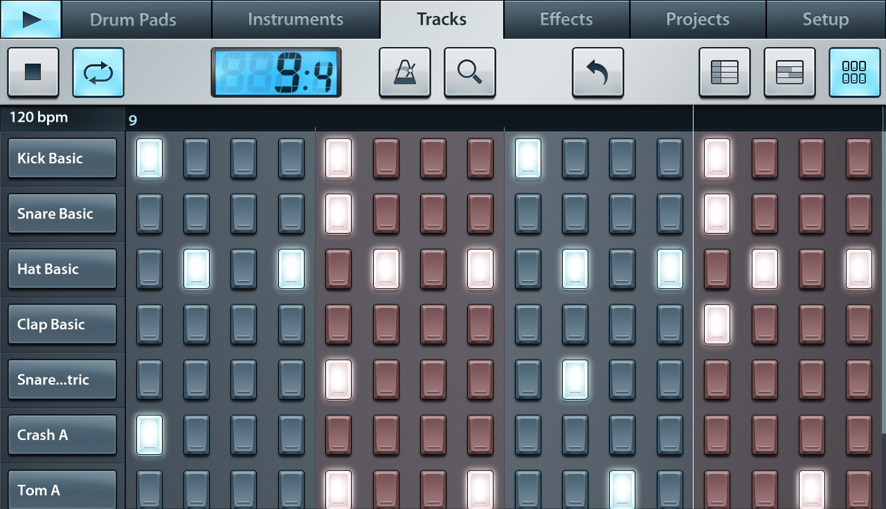 • Per-track mute, solo, effect bus, pan and volume adjustment