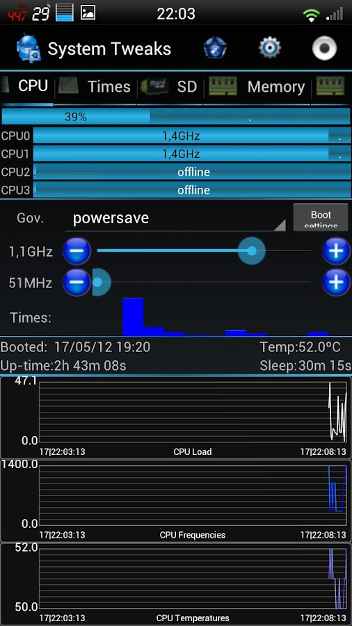 - Shows cpu load/frequency, memory/internal/sd usage